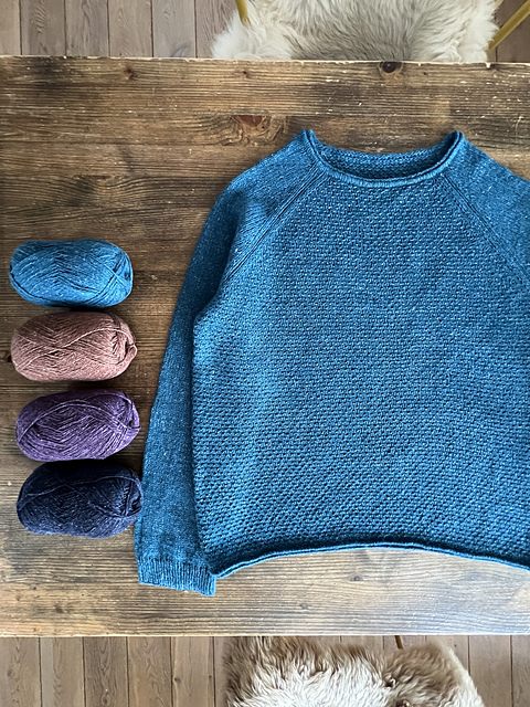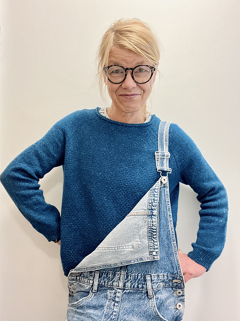 Blue Bayou wird nahtlos in Runden von oben nach unten gestrickt. Begonnen wird mit einer “Biese” und einigen verkürzten Reihen für den Halsausschnitt. Raglan-Zunahmen werden gearbeitet, bis die Schulterbreite erreicht ist und die Ärmelmaschen stillgelegt werden. Der Körper wird in Runden hinab gestrickt, er endet mit einer Biese. Danach werden die Ärmel in Runden bis zu den Bündchen gestrickt.