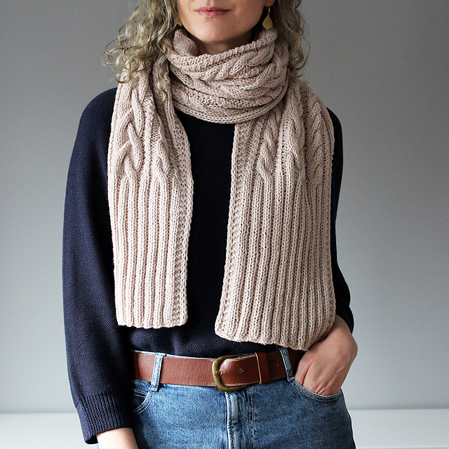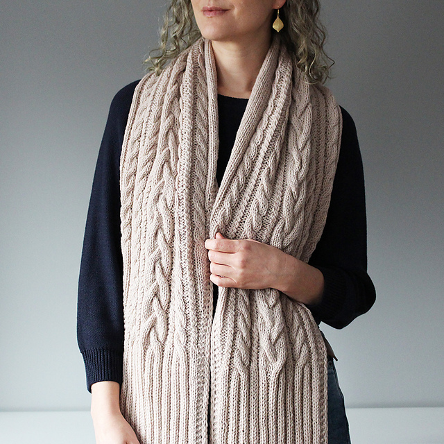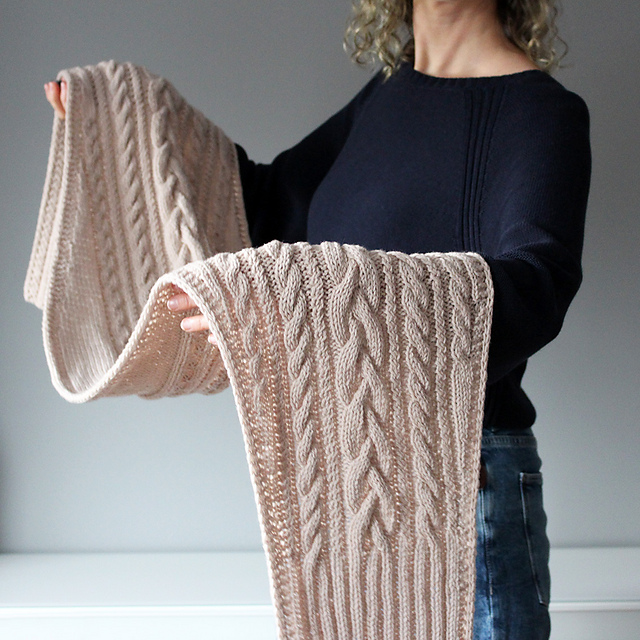 Umhülle dich in die Wärme und Schönheit des Cloudberry Wraps, einem exquisiten Wintertuch, das durch sein beeindruckendes Zopfmuster besticht. Dieses länglich gestrickte Tuch fängt mit einer Seite an und arbeitet sich kunstvoll zur gegenüberliegenden Spitze vor, wobei es zu den Enden hin elegant schmaler wird. Die Hauptattraktion ist ein zentrales Panel aus verschiedenen Zopfmustern, umrahmt von glatt rechts gestrickten Bereichen, das eine optische Tiefe und eine faszinierende Textur schafft.