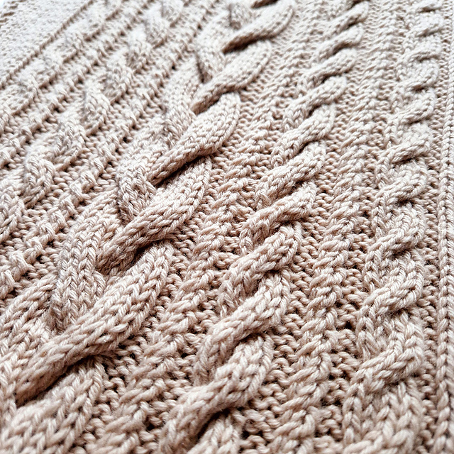 | Wolle | Entworfen für ein „worsted weight“-Garn. Die Anleitung ist leicht an andere Garnstärken und/oder Lauflängen anzupassen. Für das Mustertuch verwendetes Garn: Knitting for Olive Heavy Merino („worsted weight“, 100% Merino, 50 g = 125 m LL), 5 Knäuel (250 g = 625 m) verbraucht in der Farbe „Powder“. Zur passenden Wolle-> |