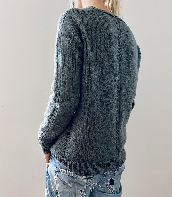 forager lite wird nahtlos von oben nach unten gearbeitet. Die Passe wird durch eine Variante, der von Susie Myers entwickelten “contiguous set-in sleeves”-Methode geformt. Zuerst wird in Reihen bis zum verbindenden Maschenanschlag für den Halsausschnitt gestrickt. Danach wird die Passe in Runden gearbeitet, bis die Ärmelmaschen stillgelegt und unter den Armen neue Maschen angeschlagen werden. Dann wird der Körper in Runden bis zu einem schmalen Zopf aus quergestrickten Maschen (optional) gearbeitet. Der Körper endet mit einem Rippenbündchen. Die Ärmel werden von oben nach unten bis zu den Bündchen in Runden strickt. Zuletzt wird der Halsabschluss gearbeitet.