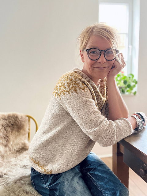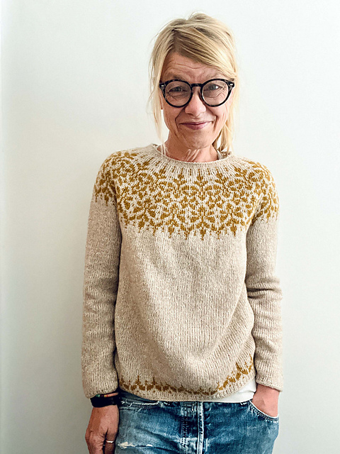 Giardino wird nahtlos von oben nach unten gestrickt. Zuerst werden einige verkürzte Reihen gearbeitet, um den rückwärtigen Halsausschnitt anzuheben. Dann wird die Passe mit ihrem floralen Einstrickmuster in Runden gestrickt. Auch der Körper wird rund gestrickt. Vor dem Bündchen wird noch einmal ein Teil des ornamentalen Musters eingefügt. Auch die Ärmel werden von oben nach unten bis zu den Bündchen in Runden gestrickt.
