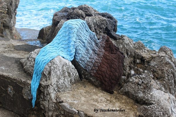 Meereswellen, inspiriert von der schönen Amalfiküste, ein neues Tuchdesign. Das Tuch wird seitwärts gestrickt und kann daher jeder gewünschten Größe angepaßt werden. Das Tuch kann mit unterschiedlicher Wolle gestrickt werden.