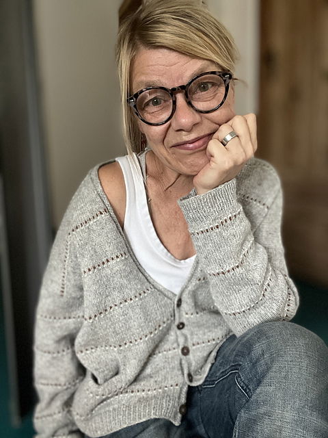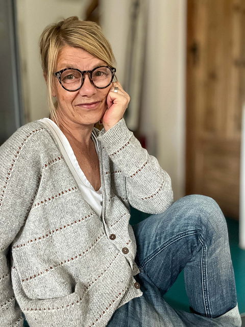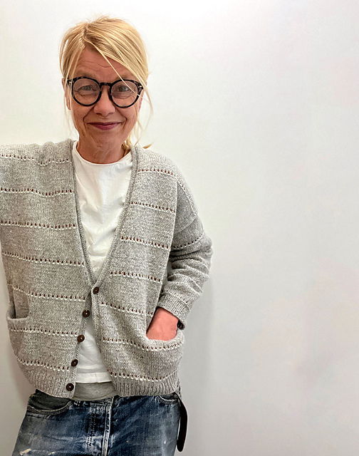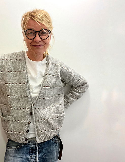 Zunächst werden die Maschen für die rückwärtigen Schultern angeschlagen. Wenn ihre Schrägung mit verkürzten Reihen fertiggestellt ist, wird der Rücken gerade bis zu den Achseln hinab gestrickt. Die Maschen für die Vorderteile werden aus der Anschlagskante der rückwärtigen Schultern aufgenommen und beide Vorderteile bis zur gleichen Längen wie das Rückenteil gestrickt. Auf Höhe der Achseln werden Rücken- und Vorderteile miteinander verbunden und alles in Hin- und Rückreihen bis zu den Bündchen hinab gestrickt. Die Taschen werden mittels eines provisorischen Maschenanschlags angelegt. Wenn der Körper fertig ist, werden die Knopfleisten gearbeitet und im Anschluss die Ärmelmaschen aus den Armausschnittkanten aufgenommen. Die Ärmel werden in Runden bis zu den Bündchen gestrickt. Am Schluss werden die Taschenbeutel eingestrickt.