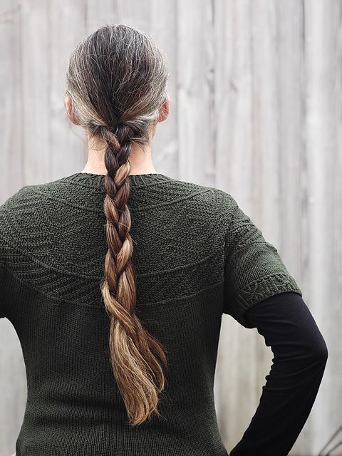 Der Polaris Sweater wird nahtlos in Runden von oben nach unten gestrickt. Er beginnt mit einem Halsausschnitt aus einem verschränkten Rippenmuster mit kleinen sternförmigen Zöpfen. Darauf folgt eine Rundpasse in einem strukturierten Muster aus diagonalen Linien und dem Hauptmuster des grossen Sterns, der aus rechten und linken Maschen besteht. Dann geht es zurück zu diagonalen Linien. Die verschiedenen Abschnitte werden durch eine querliegende Maschenreihe (Vikkel Braid) voneinander getrennt. Du kannst wählen, ob du ein normales Rippenmuster oder das verschränkte Zopfmuster stricken möchtest, ob du verkürzte Reihen für ein höheres Rückenteil, eine Taillierung und ob du lange oder kurze Ärmel verwenden möchtest.