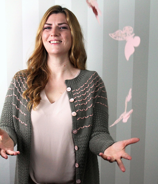 Der Cardigan Schmetterlingswiese wird von unten nach oben gearbeitet. Der Body und die Ärmel werden in einem zarten Strukturmuster gestrickt und erinnern an eine frühlingshafte Blütenwiese.