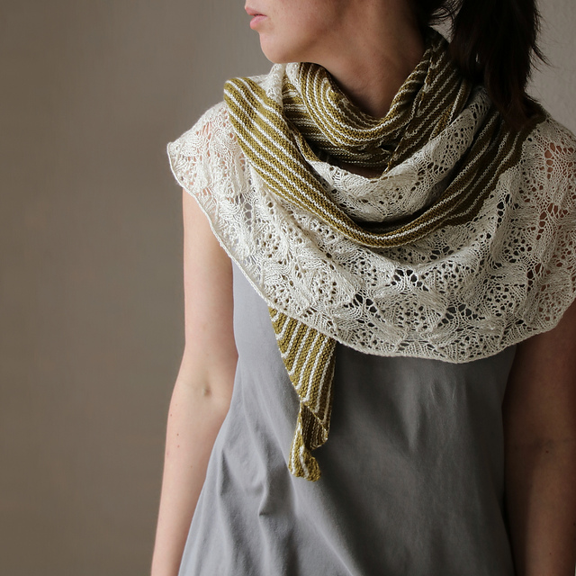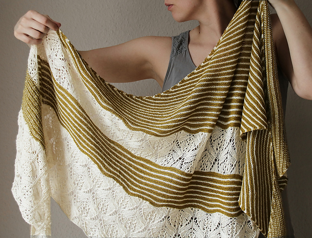 | Wolle | Shibui Knits Lunar (60% Merino, 40% Seide; 50 g / 365 m) • 2 Stränge in „Pollen“ (Farbe A) 65 g / 475 m Verbrauch • 2 Stränge in „Ivory“ (Farbe B) 86 g / 630 m Verbrauch Zur passenden Wolle-> |
