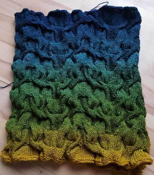 Der Cowl „Braid and Crease“ ist das perfekte Zwischendurch-Projekt mit etwas Herausforderung, aber nicht zu viel Garnverbrauch.