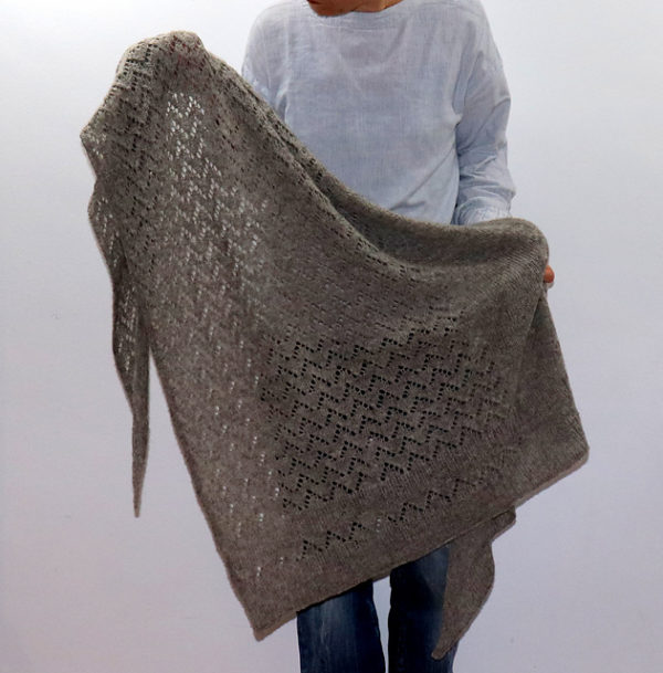 | Maschenprobe | 20 M x 27 Rh = 10 x 10 cm im Lochmuster nach dem Spannen. Die Maschenprobe ist nicht entscheidend für dieses Projekt, Abweichungen werden aber die benötigte Garnmenge und Schalgröße beeinflussen. |